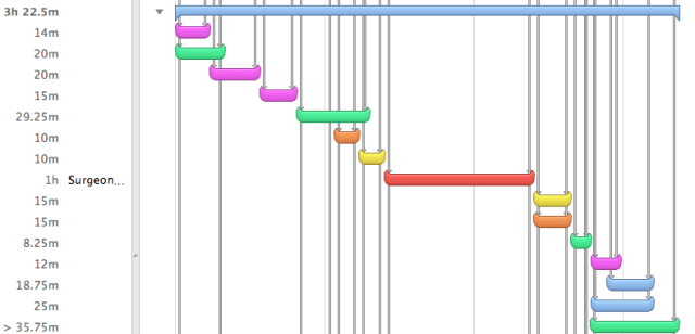 Below is a graph of durations in the scheduling and process of just the in-room surgical parts of a typical OR case. Most of the items can be altered by policy and by the conscious effort of the people involved in doing the tasks. There are lots of connections and some necessary events—hence the title of this blog:”butterflies and nails”. A few items that can be altered have a profound effect on the flow of the case and OR schedule for the day (time and money) like the butterfly that beats it’s wings in China and causes a hurricane in the Bahamas. And some items, like ‘for lack of a nail for the shoe of the horse–which lost the battle–which lost the war’, can be critical. A good model can help find the nails and the butterflies that are important (concepts, models, and simulation). Of course, a bad model is like a bad GPS….over the cliff and through the woods.