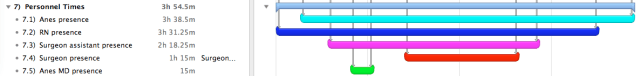 This is a visual representation to help with handling constraints in the OR. For those who use TOC, be aware that the person represented by the green bar (‘Anes MD presence’) could be simultaneously supervising four rooms at once; and he acts more like a fireman in that he may be called to any of them (and to any other room in the OR) at any time to put out ‘fires’ that affect the patient’s safety.