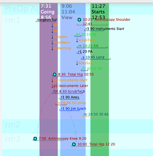 Want to know who’s doing what, when: With what? What’s starting when? Who’s got to be there? How many whos? Can you let a few people off early? Can you start a few people late? How many people need to be broken for lunch? How many (and which) cases are starting in the next 15 minutes? The next 30 minutes? The next hour?