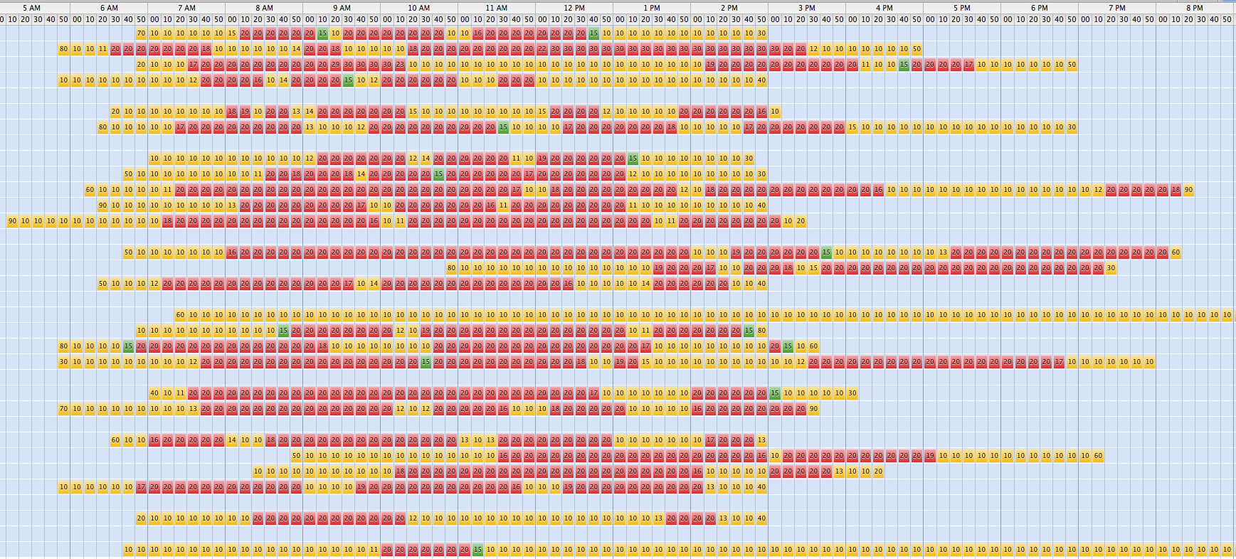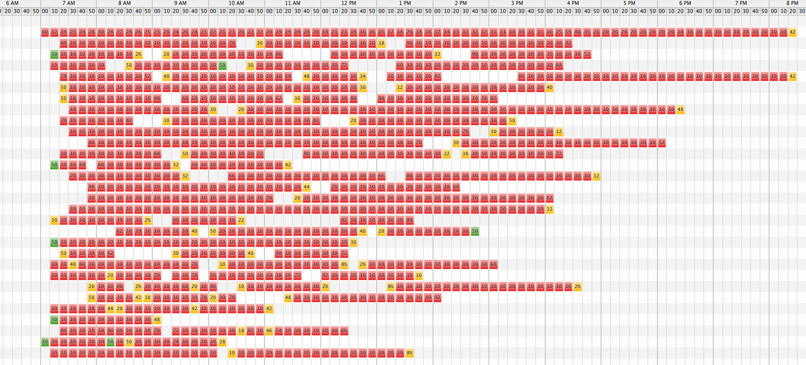 For a different graphic view of crna employee time paid vs crna down time see the following graphs. Each red square represents a 10 minute period during which 100% of the time the CRNA is clocked in she’s actually involved with a case (generating revenue) as indicated on an anesthesia record. Green represents less than 100% of the 10 minutes (1-10). Yellow means that the CRNA was being paid a salary but not bringing in revenue.