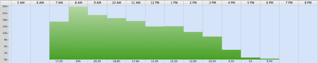 This is a graph of the CRNA usage for the Optimized Surgeon schedule from the blog post dated Jan 20, 2010. Compare this graph to the ones in the blog dated Jan 17, 2010 “Do you know where your CRNAs are?“. The total amount of actual working time for the CRNAs in this graph is 157 hrs instead of 147 hrs in the actual non-optimized graph, mostly because I rescheduled a 7 hr neurosurgical case from around midnight to earlier that day to see the effect of moving quasi-emergency cases that could have been accomplished earlier if there had been time available. In addition there will be some discrepancy because of variations in anesthesia preparatory time for the first cases of the day.